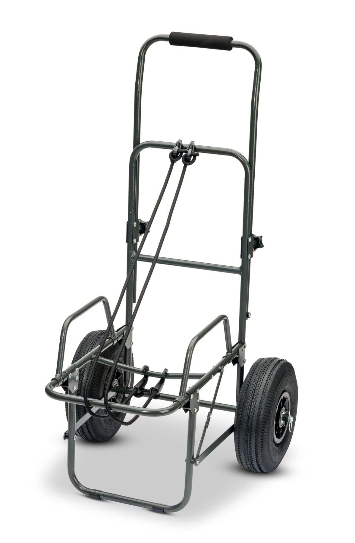 Felállított állapotban meglepően nagy pakolófelületet biztosít, míg összecsukva rendkívül kompakt, így akár az autó legkisebb csomagtartó-sarkában is elfér. A porfestett acél váz kimagasló stabilitást nyújt, a levegős kerekek pedig kiváló terepjáró képességet garantálnak. A kerekek gyorsrögzítő biztosítószeggel pillanatok alatt levehetők, és az ehhez mellékelt tárolótáskában könnyedén szállíthatók.